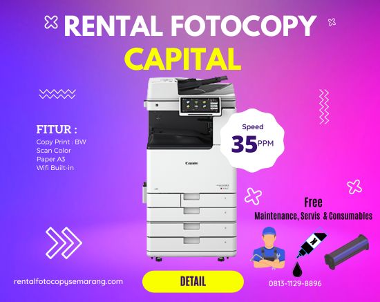 Rental Fotocopy CAPITAL merupakan Layanan ini menggunakan mesin Canon iRA DX 4735, fitur standar Copy, Print B/w dan Scan Color. Speed 35 ppm. Mesin Fotocopy Rekondisi.